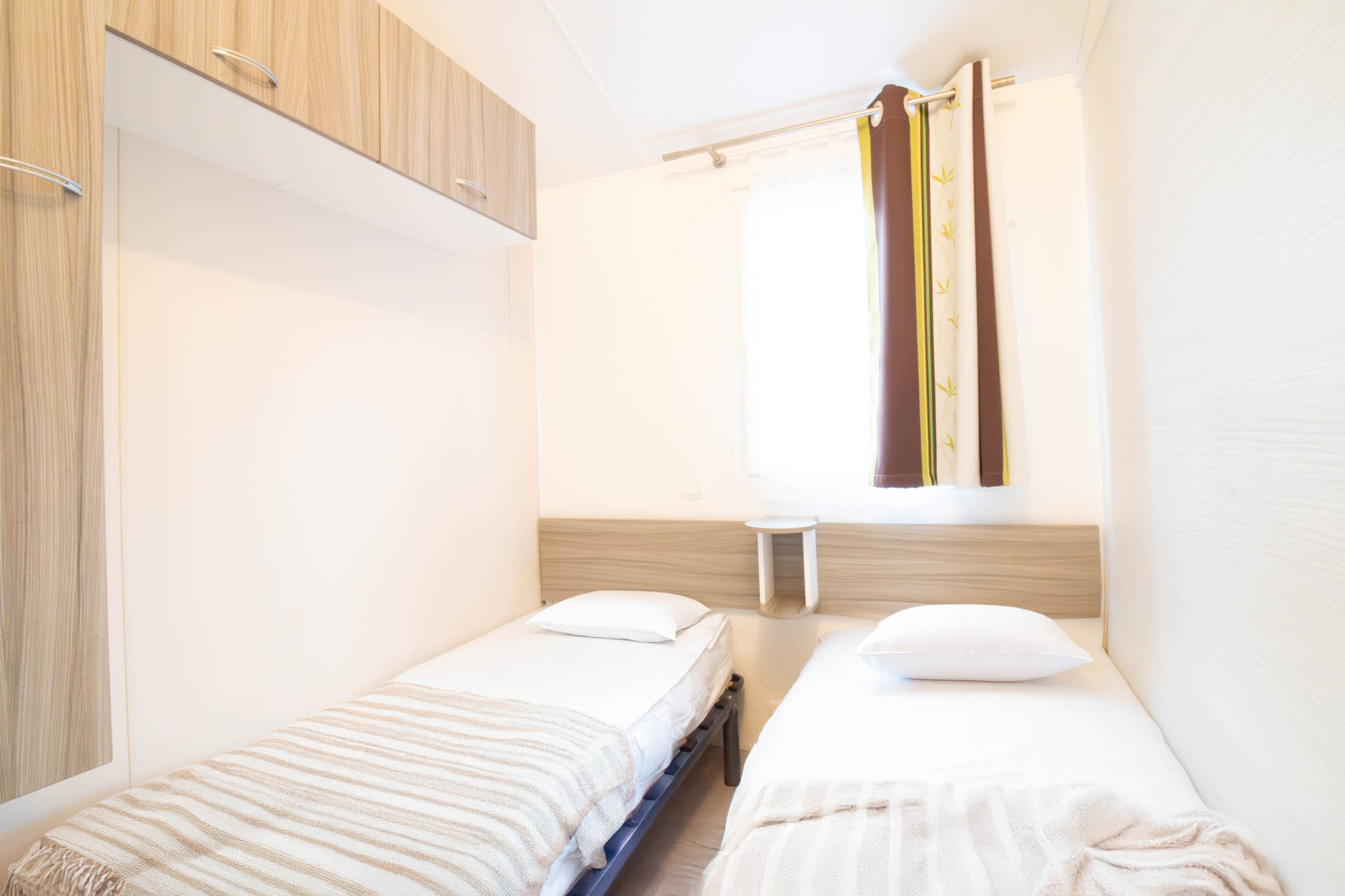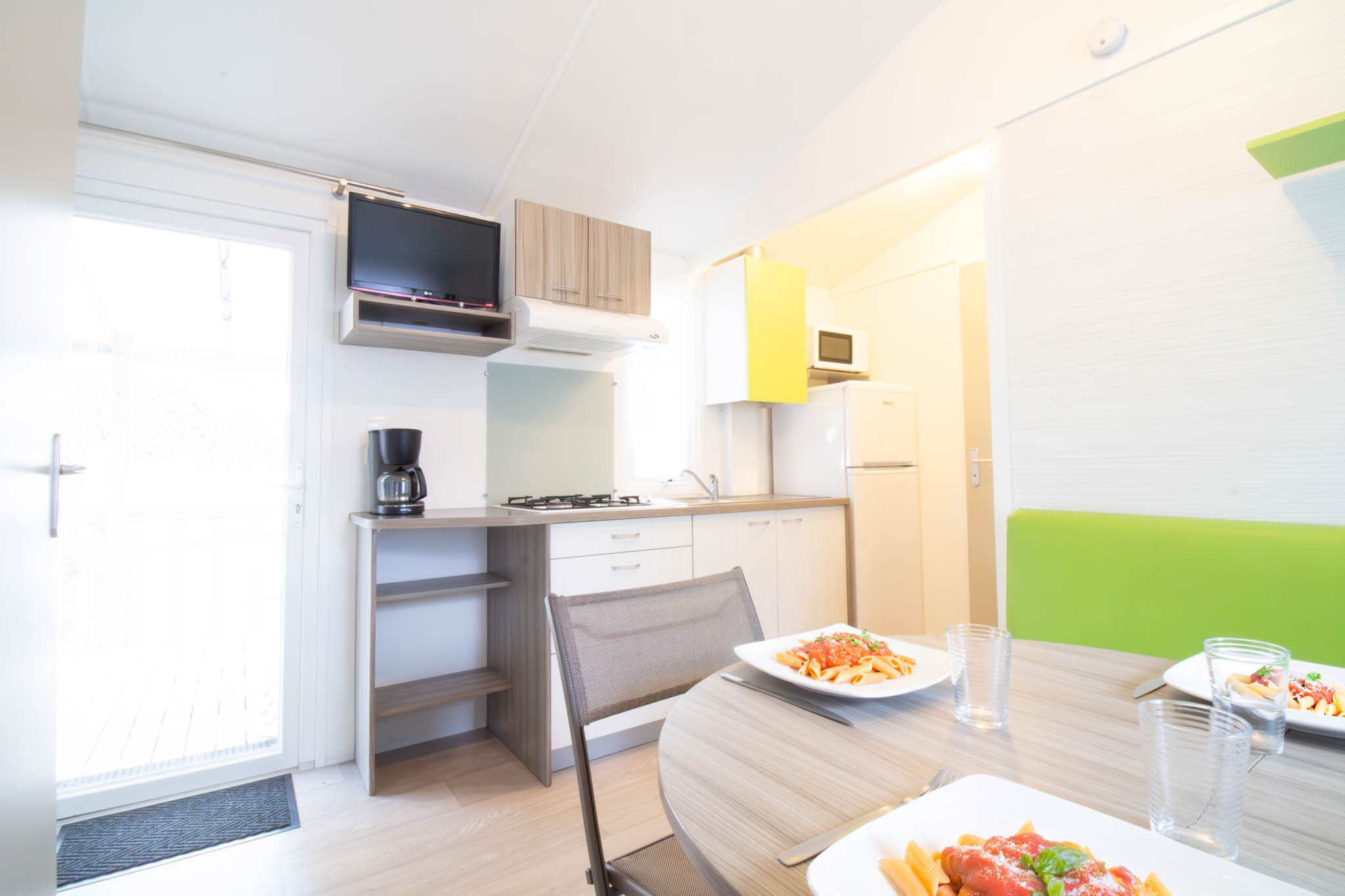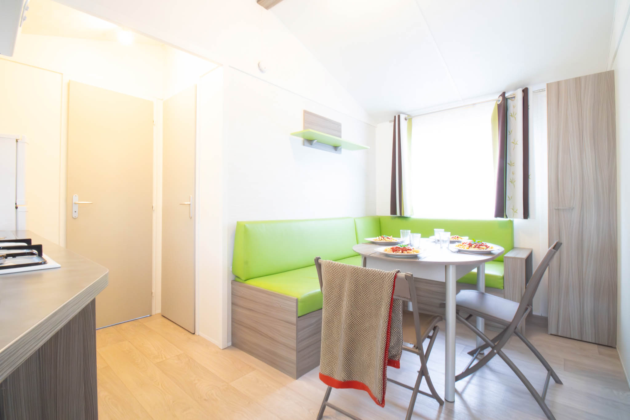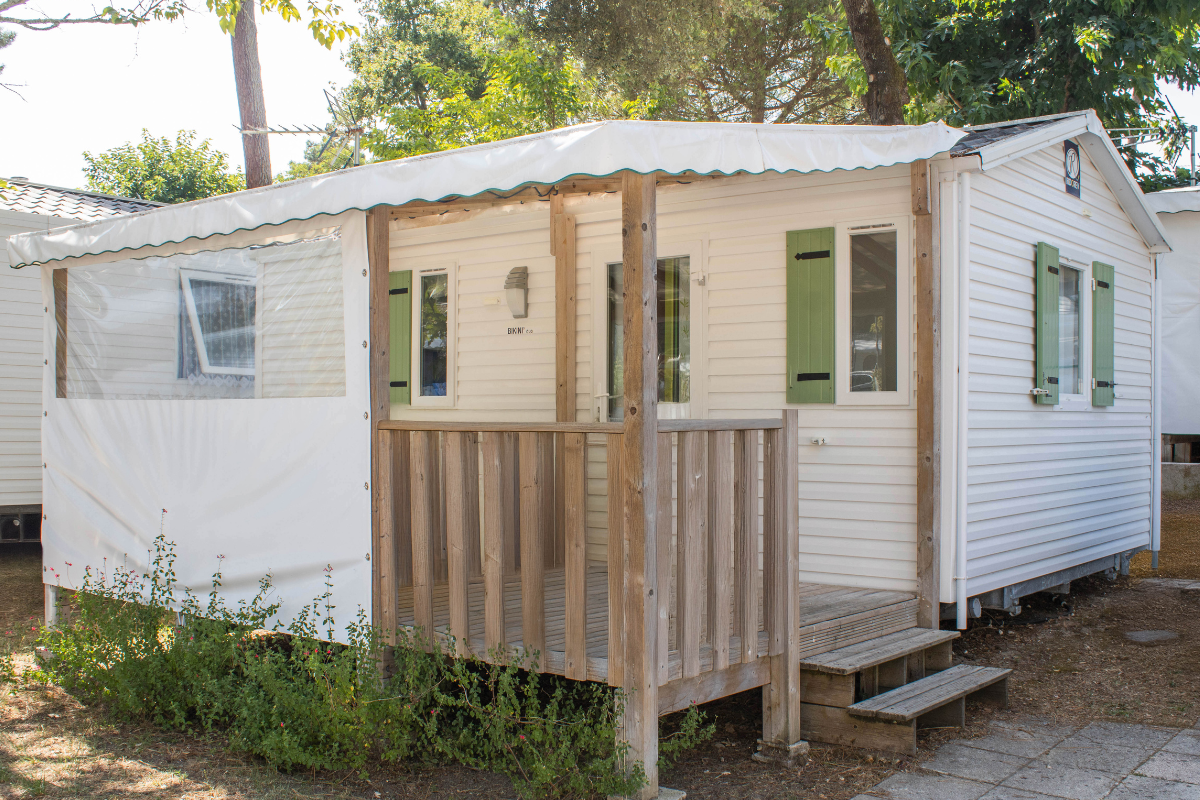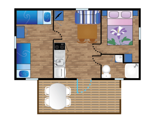 Le mobil-home Alcyon est idéal pour des vacances en famille ou entre amis. Il se compose de deux chambres confortables : une avec un lit double et une avec deux lits simples. L’espace séjour lumineux avec salle à manger et télévision permet de partager des moments conviviaux après une journée de plage ou d’activités.