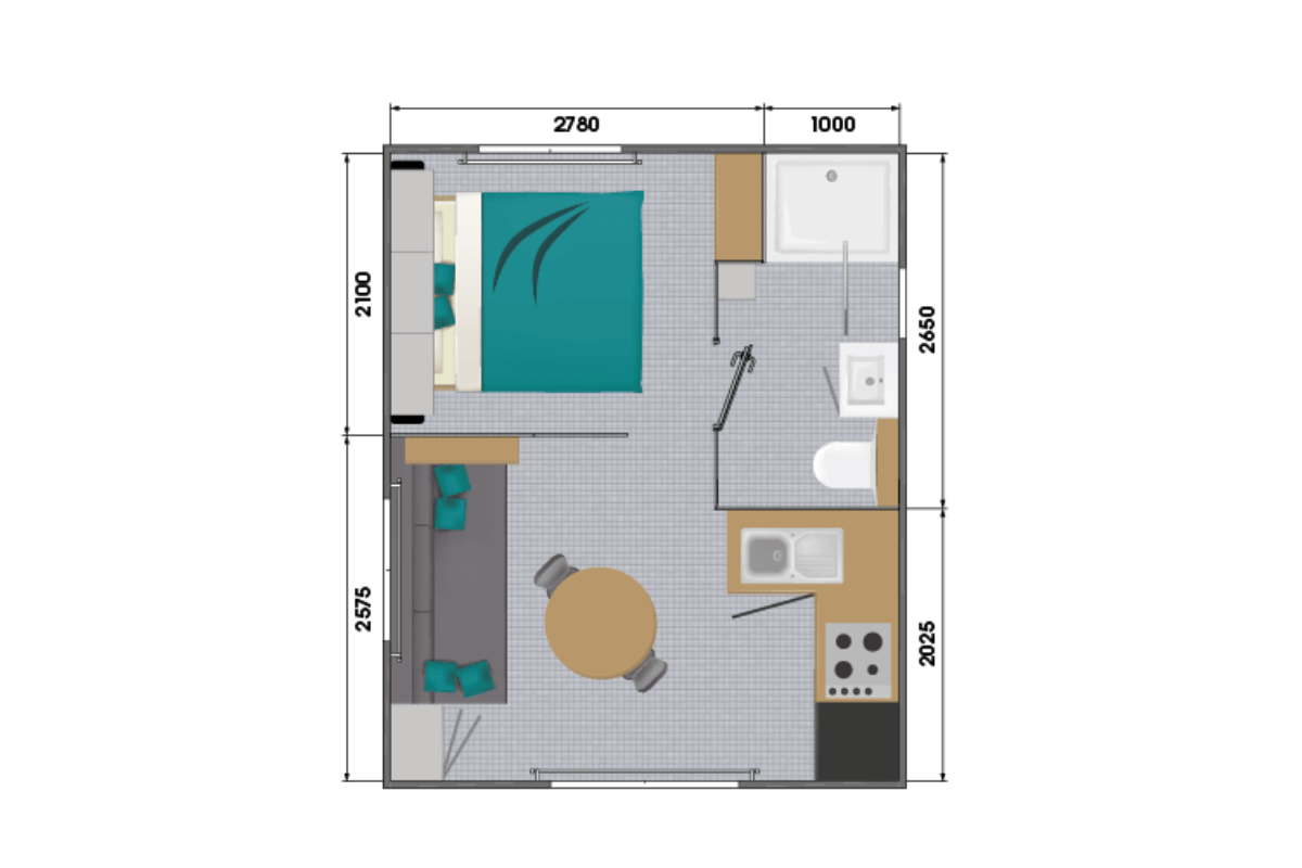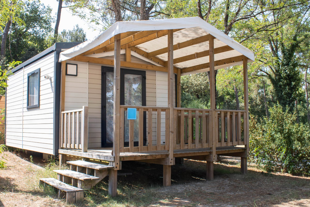 Il dispose d’un coin nuit avec lit double, d’un espace séjour lumineux avec télévision, d’une cuisine équipée (réfrigérateur, plaque de cuisson, micro-ondes, cafetière) ainsi que d’une salle de bain avec douche et WC. À l’extérieur, une terrasse couverte avec salon de jardin vous permet de partager vos repas en plein air et de vous détendre dans une atmosphère conviviale.