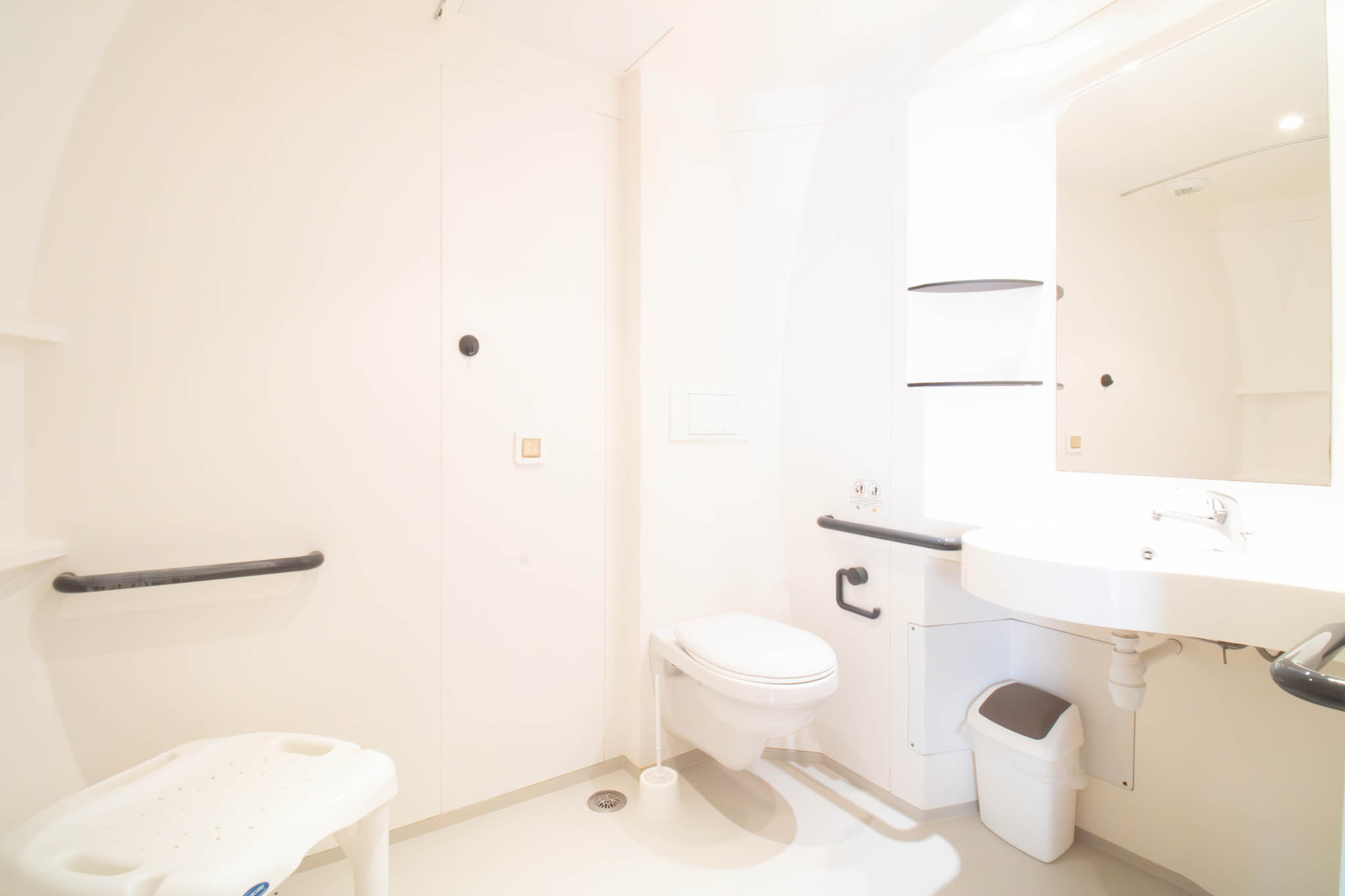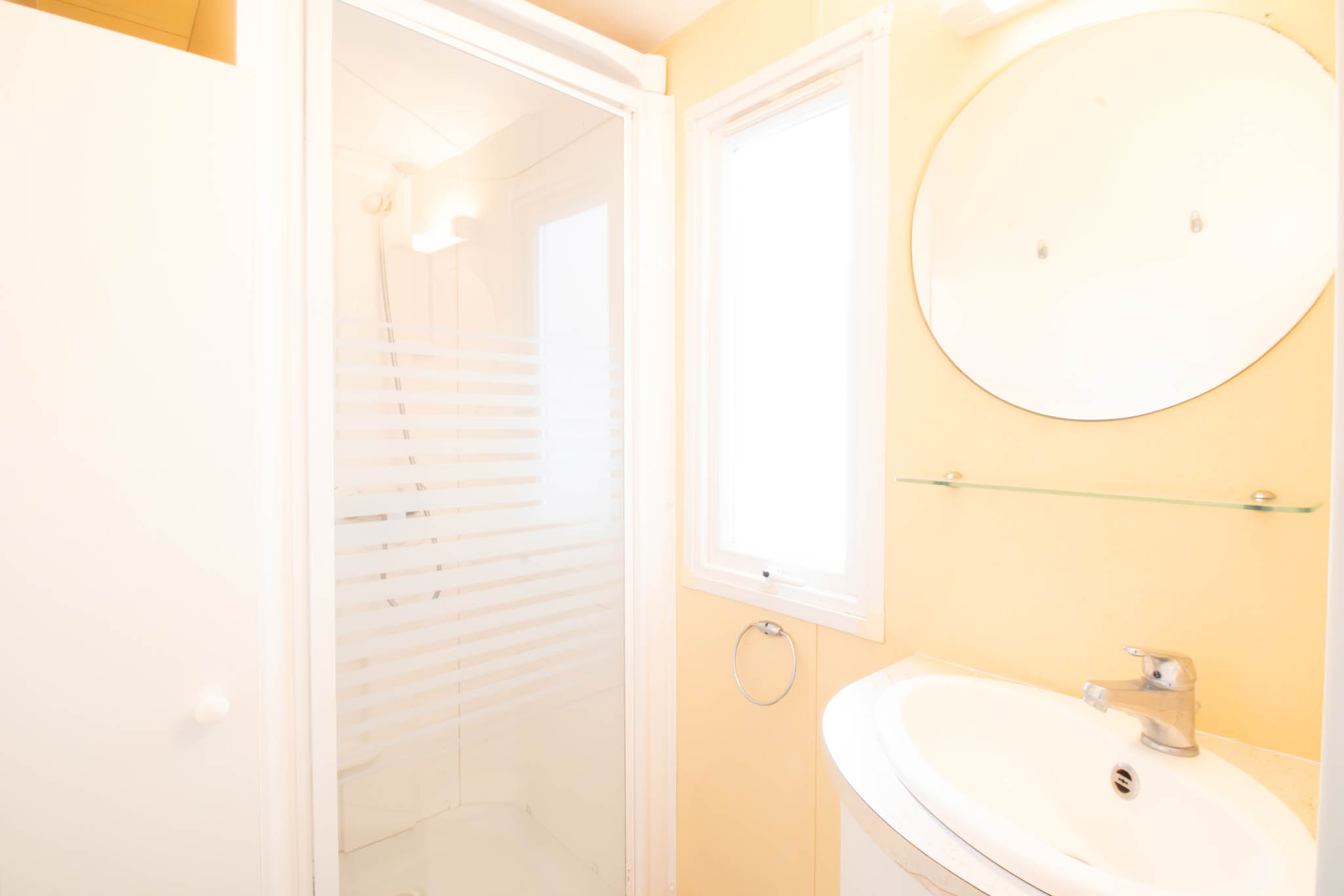 La salle d’eau est aménagée avec douche, lavabo et WC accessibles, garantissant un confort optimal. Le mobil-home bénéficie également de la climatisation réversible pour un séjour agréable en toute saison.