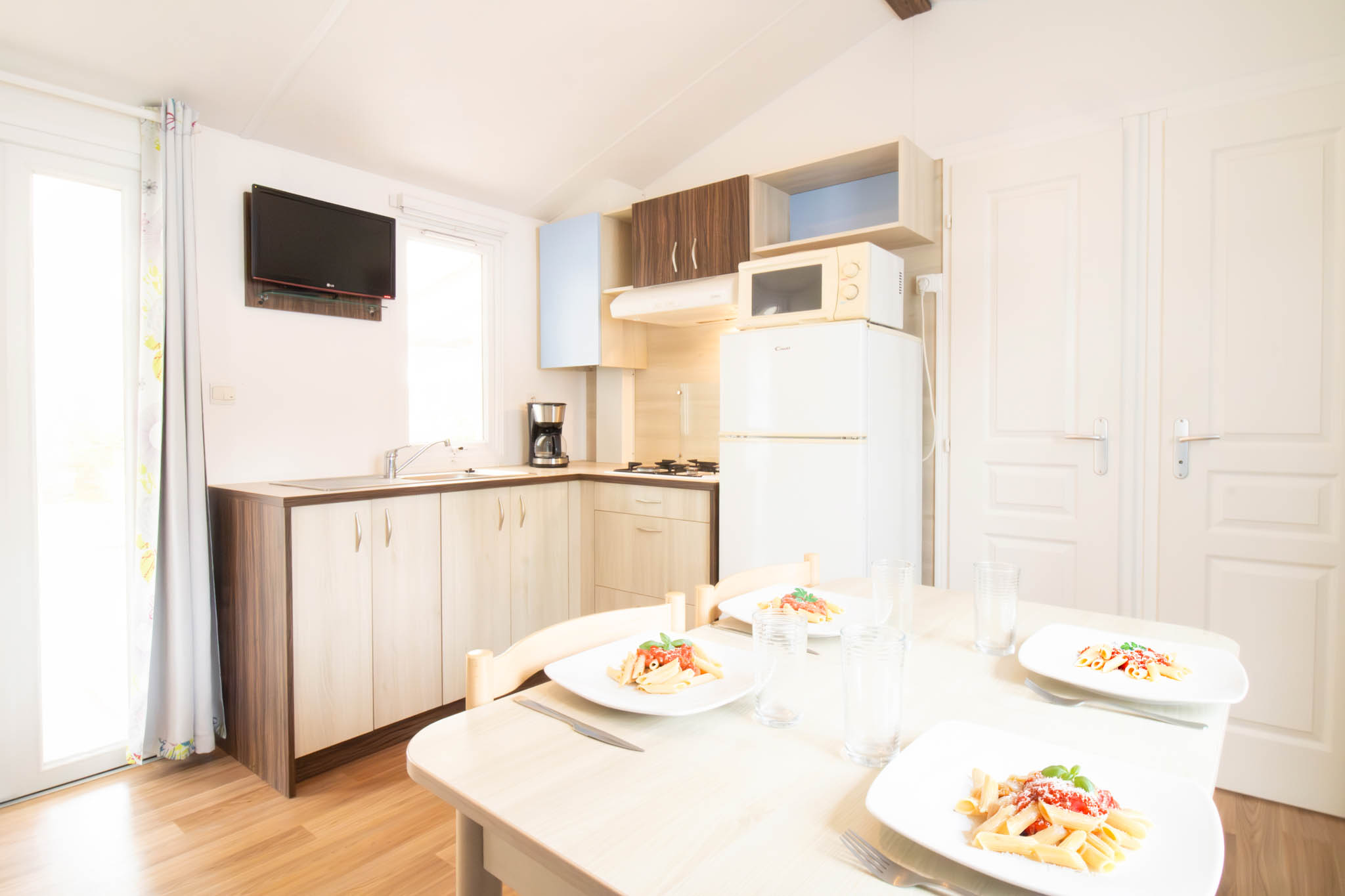 Son séjour lumineux avec salle à manger et télévision est un espace convivial pour se retrouver après une journée de plage ou d’excursions. La cuisine équipée (réfrigérateur, plaque de cuisson, micro-ondes, cafetière électrique et vaisselle) vous permet de préparer vos repas en toute autonomie.