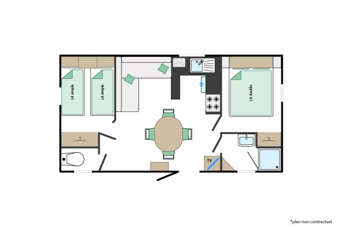 Le mobil-home Galion est conçu pour offrir confort et praticité lors de vos vacances en famille ou entre amis à Saint-Georges-de-Didonne. Il dispose de deux chambres : une avec un lit double et une avec deux lits simples, parfaites pour accueillir jusqu’à 4 personnes.