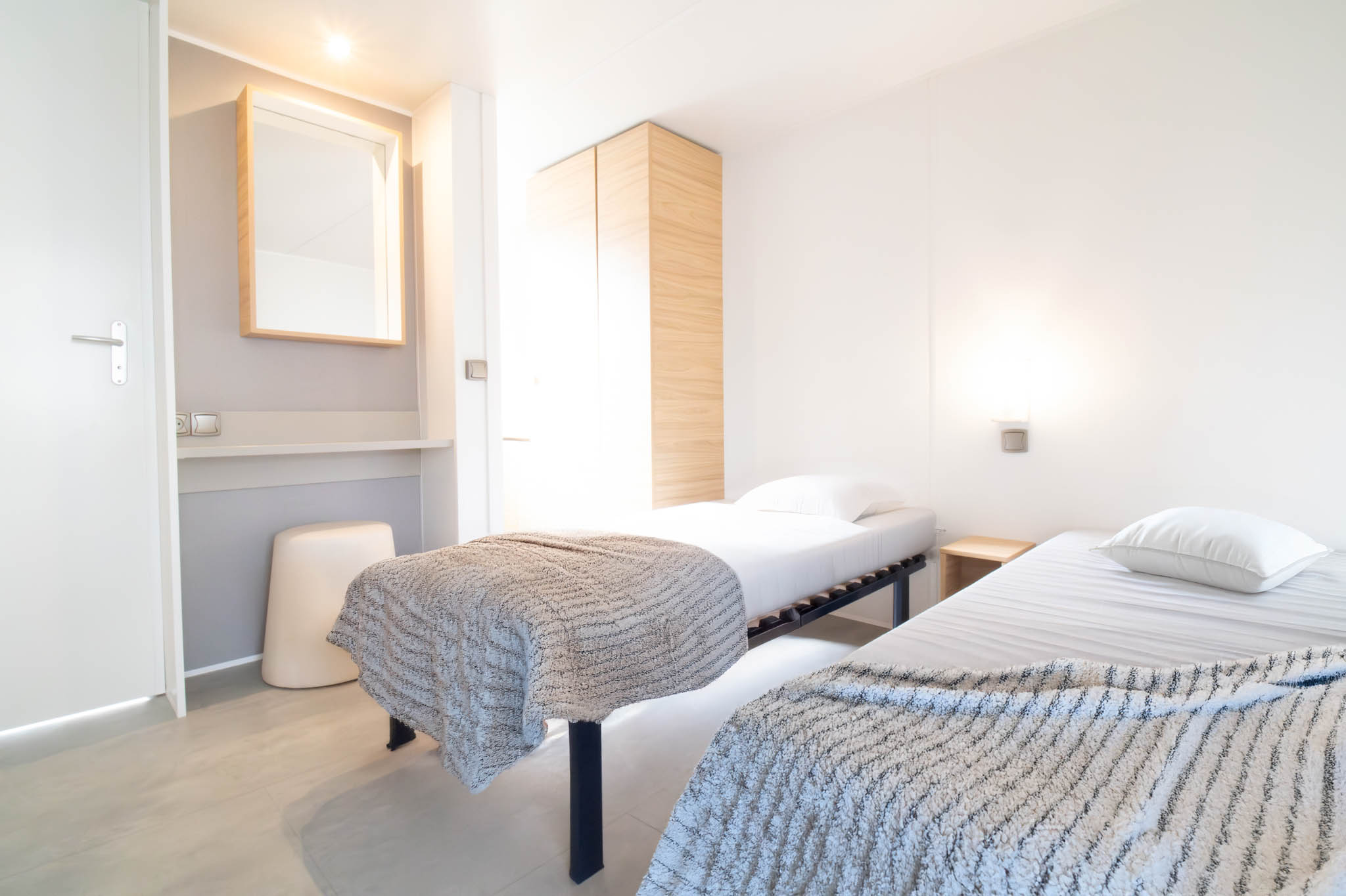 Le mobile home Opale est spacieux et moderne est idéal pour des vacances tout confort en famille ou entre amis à Saint-Georges-de-Didonne. Il dispose de deux chambres : une avec un lit double 160×200 cm et une avec deux lits simples, parfaites pour accueillir 4 personnes.