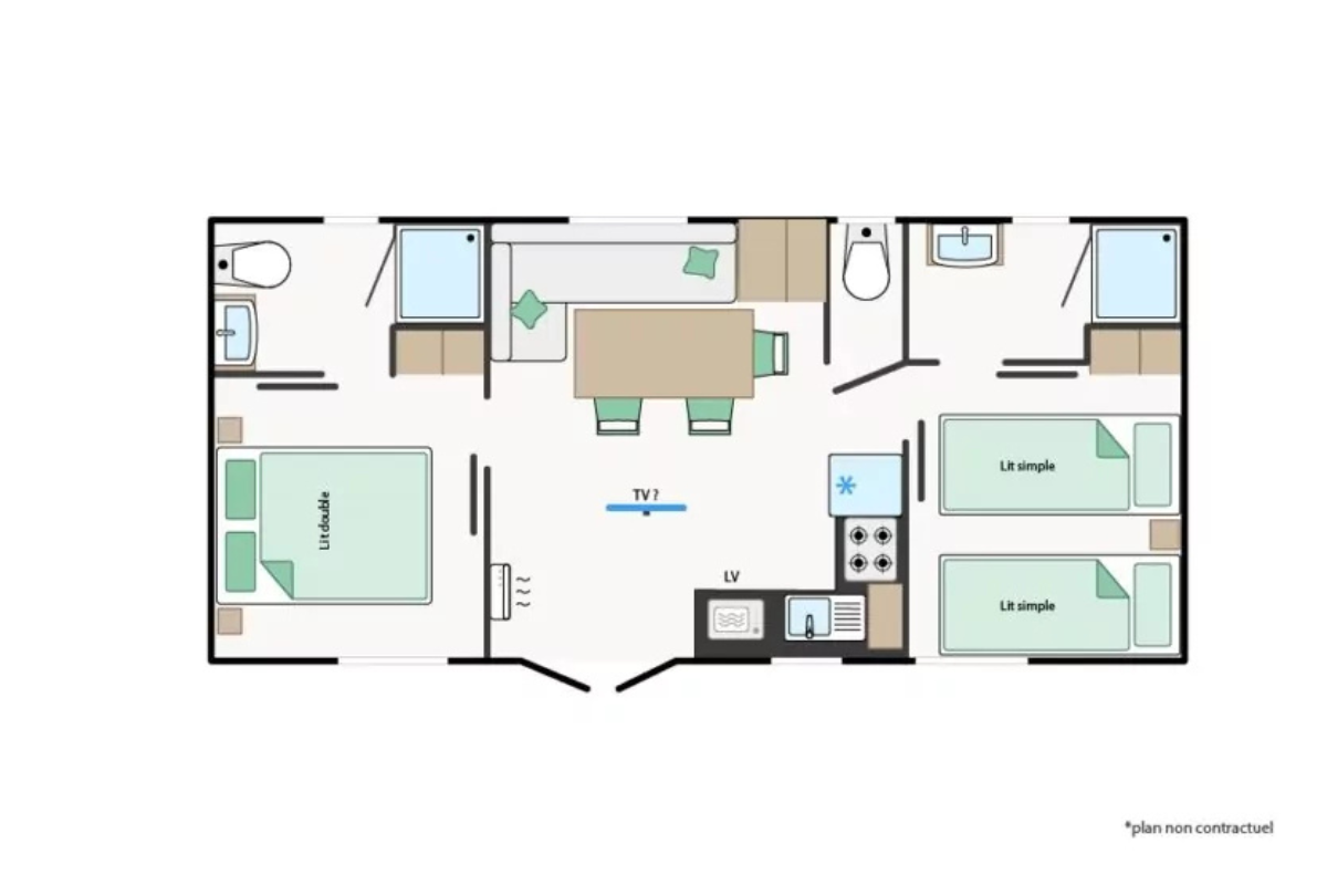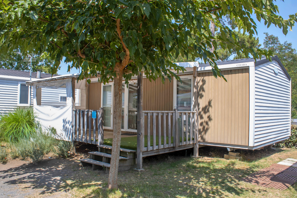 Le mobil-home Opale combine confort et modernité avec ses 32m² : 2 chambres, 2 salles d’eau, cuisine équipée avec lave-vaisselle, TV, climatisation réversible et terrasse couverte. Idéal pour un séjour en famille à Saint-Georges-de-Didonne, près de Royan.